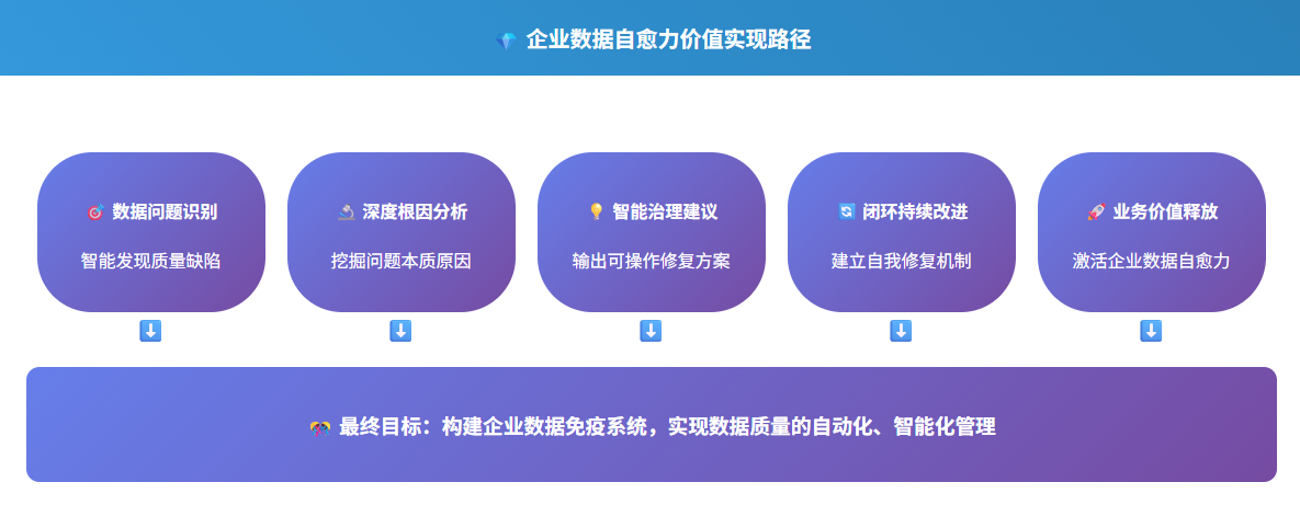 數(shù)據(jù)質(zhì)量智能體通過(guò)自然語(yǔ)言處理引擎解析報(bào)告中的復(fù)雜指標(biāo),將專(zhuān)業(yè)術(shù)語(yǔ)轉(zhuǎn)化為業(yè)務(wù)可讀性語(yǔ)言,自動(dòng)標(biāo)注關(guān)鍵異常點(diǎn)并關(guān)聯(lián)歷史趨勢(shì);結(jié)合知識(shí)庫(kù)中的業(yè)務(wù)場(chǎng)景模型,智能定位影響最大的質(zhì)量缺陷,通過(guò)可視化看板動(dòng)態(tài)推演問(wèn)題成因與業(yè)務(wù)影響路徑,最終輸出分級(jí)決策建議 —— 讓非技術(shù)角色也能秒懂?dāng)?shù)據(jù)健康度,驅(qū)動(dòng)精準(zhǔn)治理行動(dòng)。